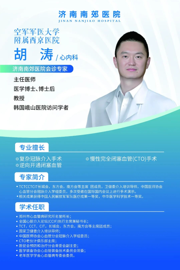 胡涛教授是空军军医大学西京医院心血管介入领域的权威专家。二十余年深耕一线,他在复杂冠脉病变、慢性完全闭塞病变等疑难重症的介入治疗方面造诣深厚,尤擅以精准、高效的技术完成高难度血管重建,被誉为“介入圣手”。此次会诊,他将带来国内最前沿的介入治疗理念与技术,为每位预约的复杂病变患者提供从病情评估、方案制定、手术规划到术后康复指导的全流程、“国家级”诊疗服务。