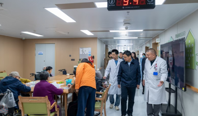 调研组一行首先参观了南郊医院门诊大楼、急救中心,在参观健康大厦时听取闫章恒院长有关南郊医院医康养服务体系建设的介绍,重点围绕组织领导、功能设置、设施设备、人员配备、服务流程五项核心内容进行检查。调研督导组通过实地参观康养中心的生活照料区、医疗护理区、康复训练区及文化活动区,详细查看了适老化设施配备、医疗设备运行、消防安全通道设置等情况,并仔细查阅了安全生产管理制度、应急预案、值班记录及服务对象健康档案等台账资料。